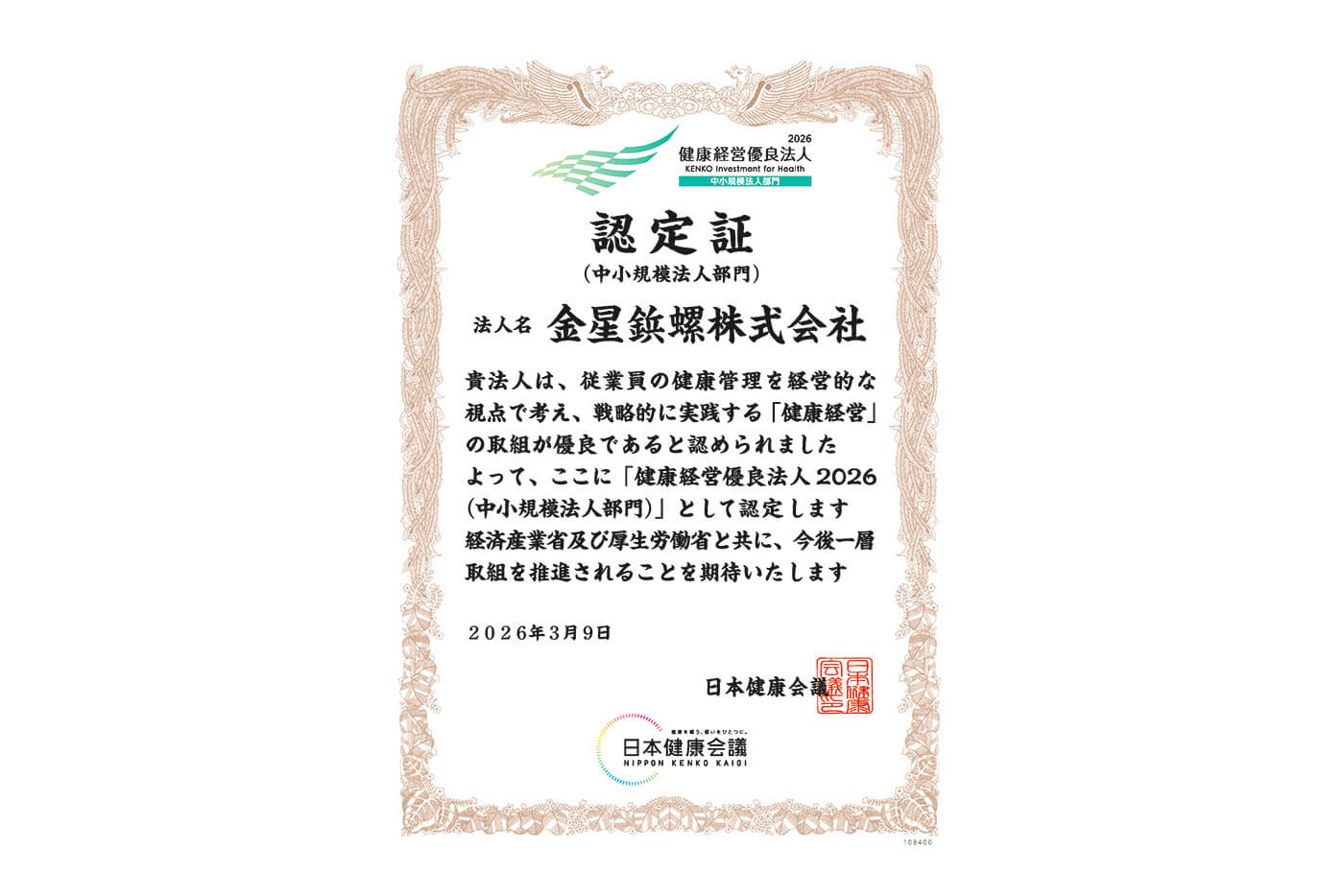 金星鋲螺株式会社は、経済産業省と日本健康会議が進める「健康経営優良法人認定制度」に おいて 「健康経営優良法人2026(中小規模法人部門)」に認定されました。
